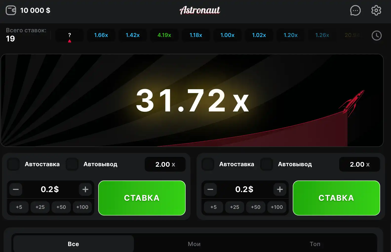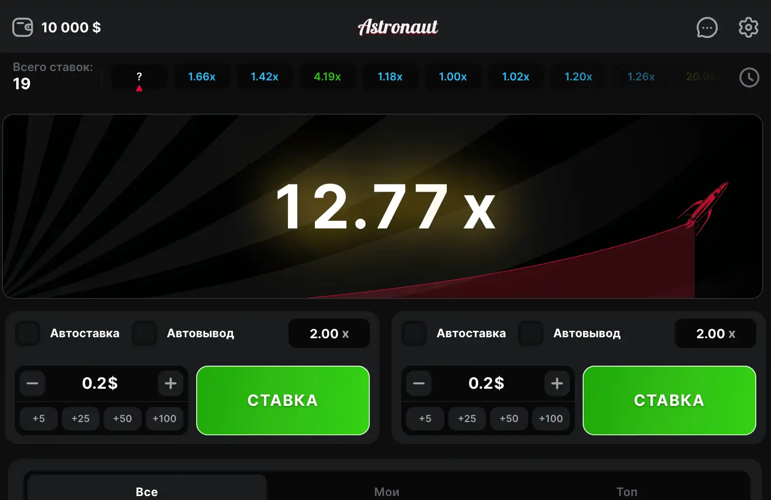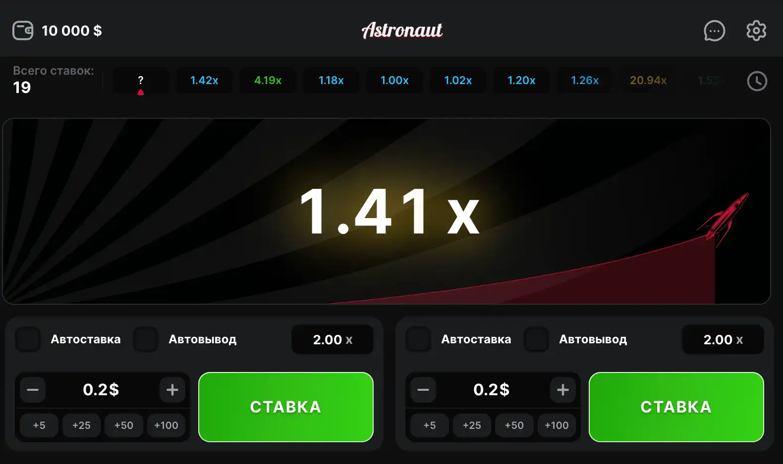 - Умножитель (x) — число, возрастающее во время полета; чем выше – тем больше итог при своевременной остановке.